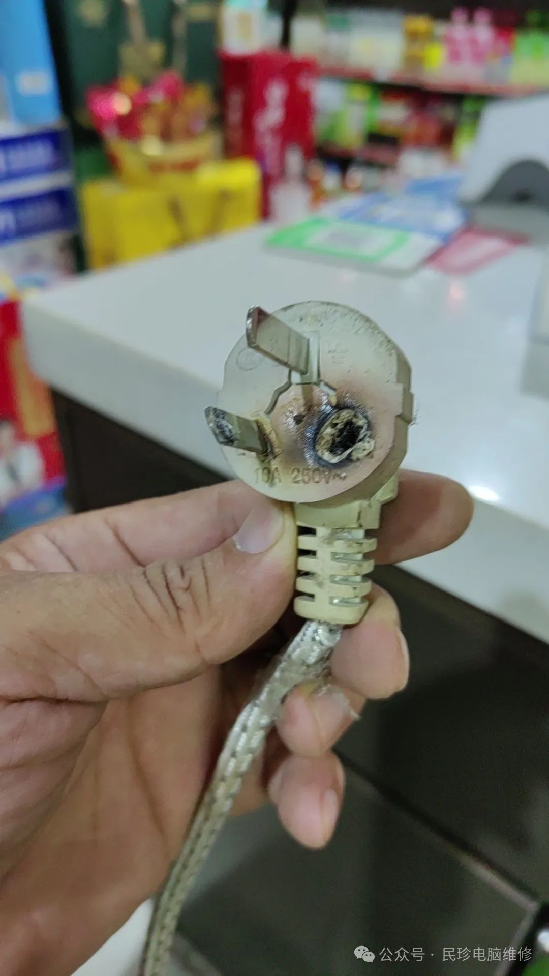 一个10多年的老客户打电话说电脑反复重启,由于现在是三伏天,我第一反应是不是系统过热了?兴冲冲的过去以为10分钟能搞定,结果过去一检查系统根本就没有过热,机箱也是凉凉的。难道说电压波动太大?!我找了个宽幅电源换上,结果还是重启。接下来怀疑系统的事,为了节省时间,我直接拿了我提前做好镜像的硬盘插上,你猜怎么着,还是重启?!接下来我应该怀疑主板了,找了个同型号的新主板换上,结果还是重启?!这下把我整不会了,到这里我陷入了灵魂拷问,我到底会不会修电脑?干脆我从我这边直接带一个确认良好的主机过去,看看到底还会不会重启?结果接上我的主机还是重启,这时我心里有数了,应该和主机没有关系,我把目光投到了电源线上,结果拔下了电源线,一看插头都烧糊了,废话不多说了,直接上图。换好新电源线故障从此解决。这个故障的关键是从外观看不出插头损坏。维修之路漫漫,我到现在还是一个小白。